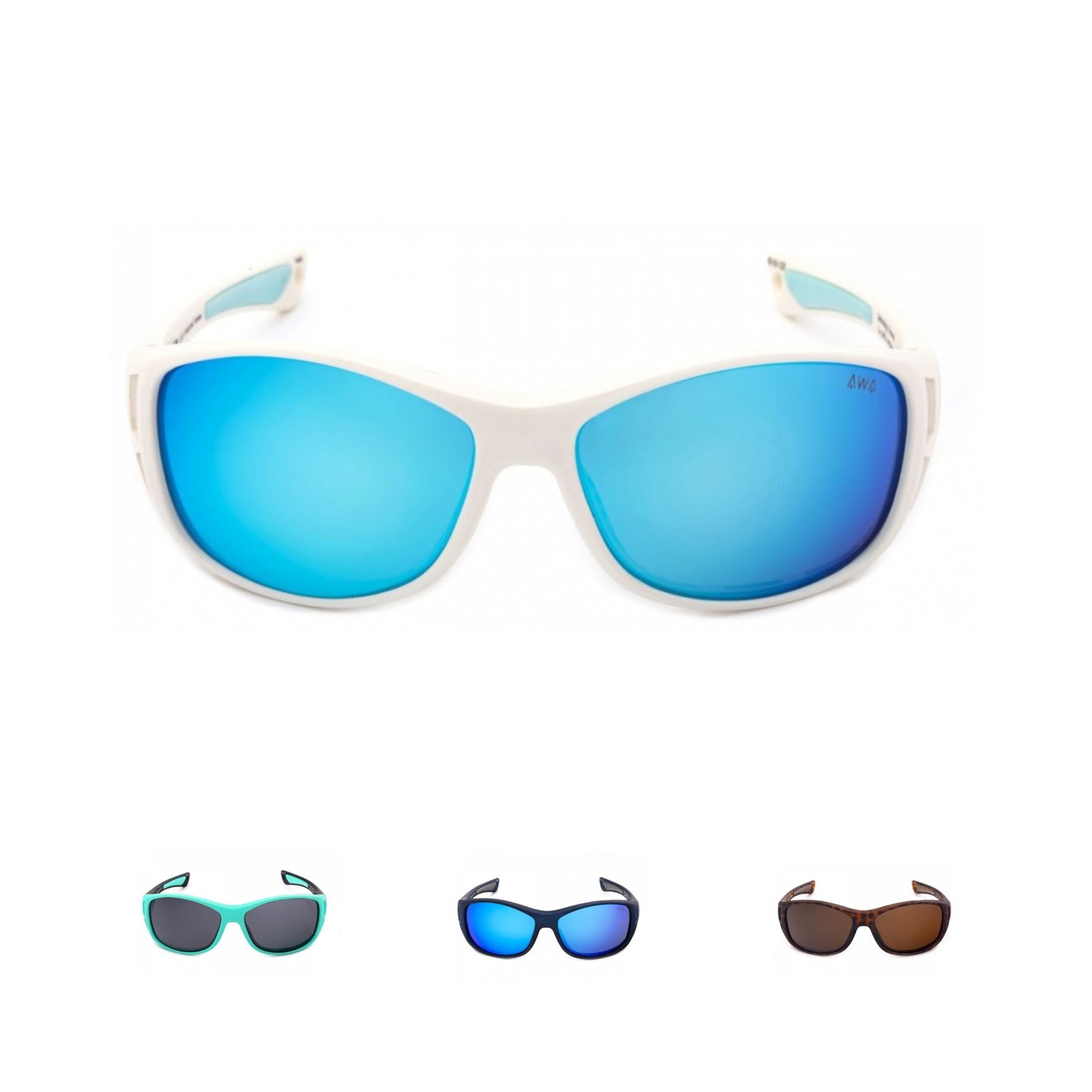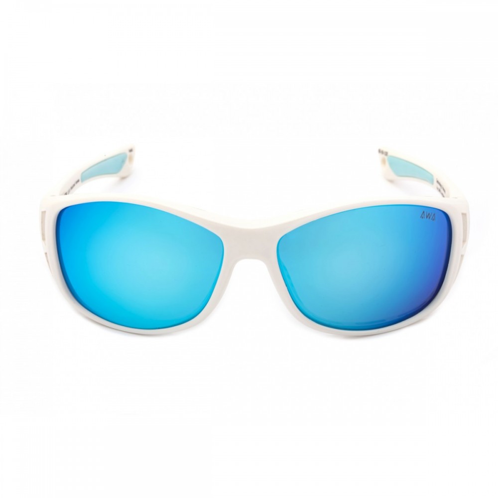 Gafas de sol flotantes deportivas, ultraligeras y resistentes con puntos de contacto engomados en patillas y almohadillas para un agarre óptimo. Montura ergonómica con acabados en blanco mate (Cat.4) , verde AWA, marrón carey y azul metalizado, envolvente con orificios de ventilación en la parte superior perfectas para deportes náuticos.